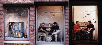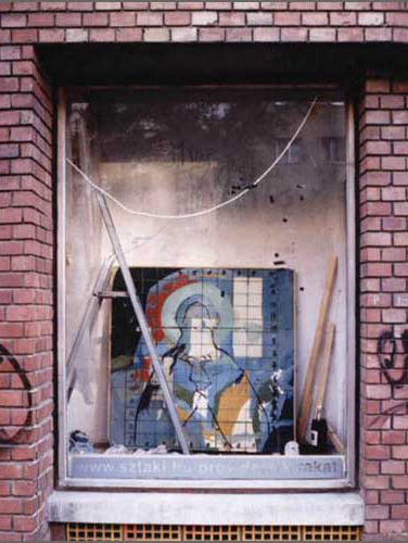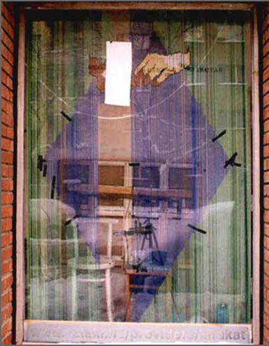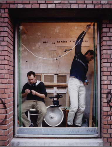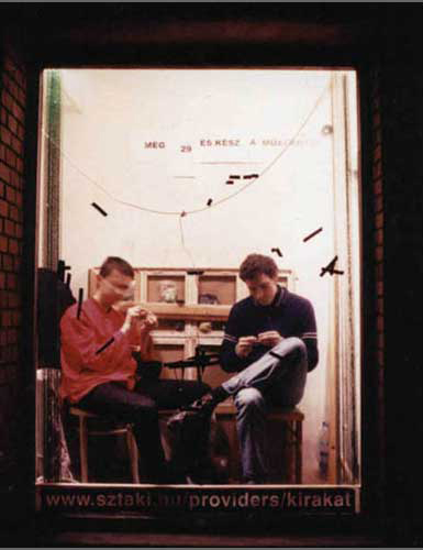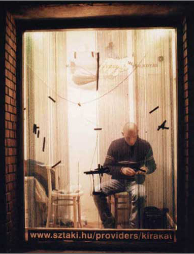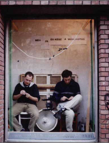 Beatrix Szörényi, Miklós Mécs, Tamás Kaszás, Attila Kispál, Anikó Loránt. The time spent in conjunction with these artists, the assistance they provided and the dialogues generated were all important points for me. On average, I spent 6-8 hours a day working in the gallery's window. After the pearl-image has been completed, it was exhibited for one day longer, before being destroyed (and the pearls returned). The final image depicted two hands sewing pearls. This motif was reminiscent of Christian icons, often making use of the isolated hand motif, symbolizing the creator.