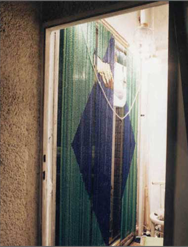 “Screen” the light-fooded curtain has spots on it. The amorphous surface of the spot represents the accidental, the unexpected. It is like the spirit that changes and flters light.