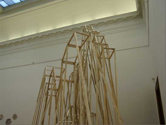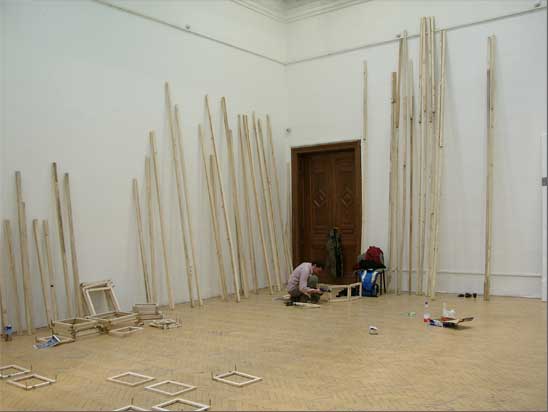 “The gigantic installation, “recycled” in several contexts, was practically the reconstruction of a national symbol, blending the artist’s uniquely constructivist affinities with his criticism of painting, since the installation was practically constructed of dismantled and recompiled canvas stretchers. Therefore, the work might be considered a reinterpretation of a particular landscape painting. By rebuilding (objectifying) the symbolic landscape as a skeleton-structure,