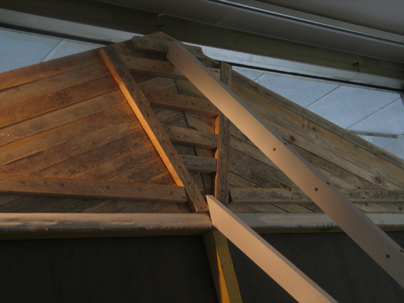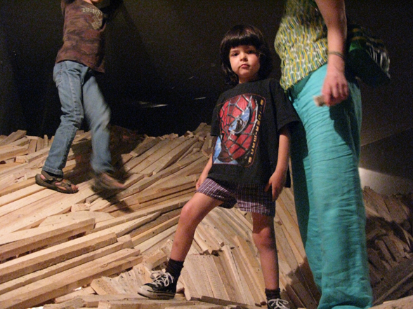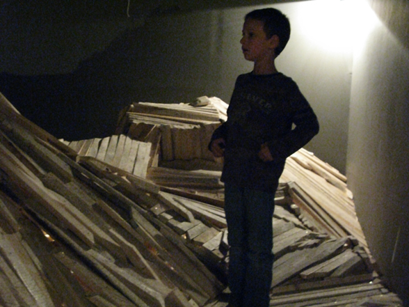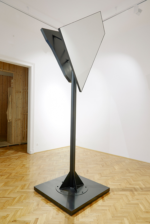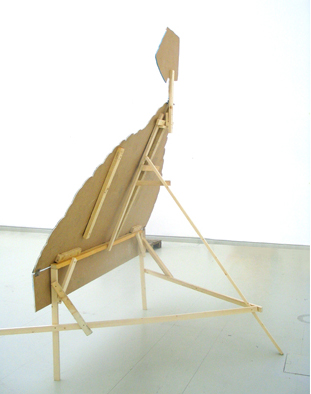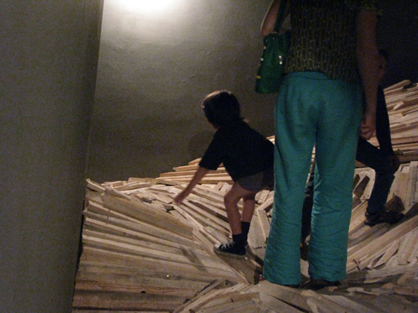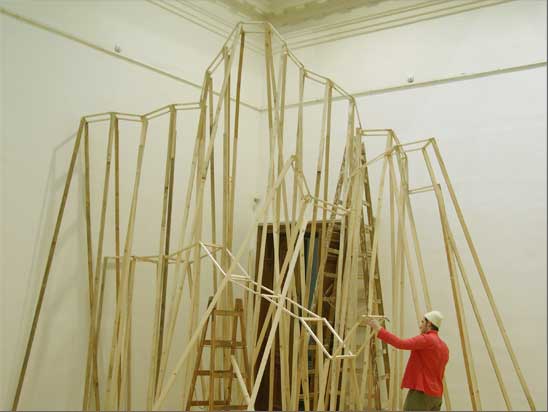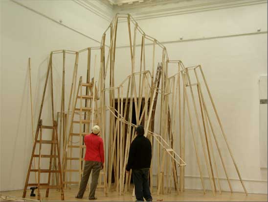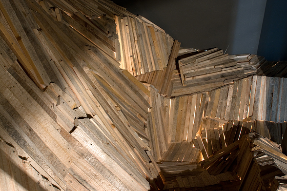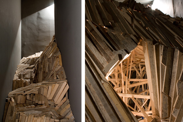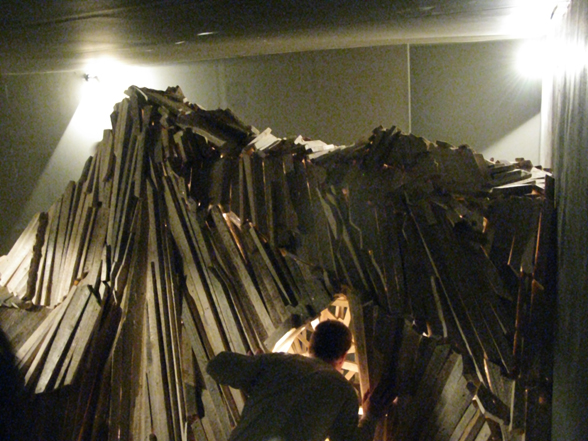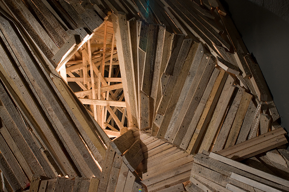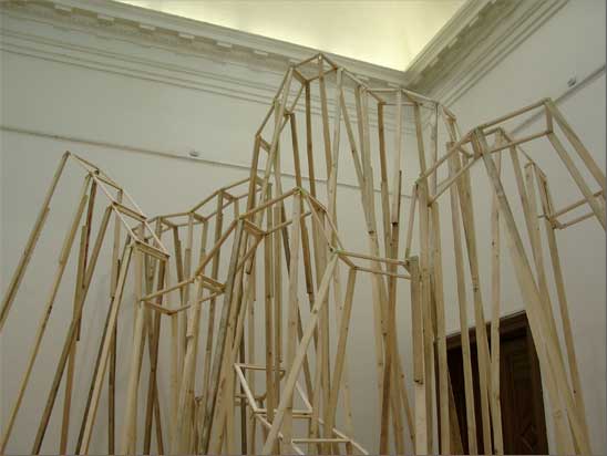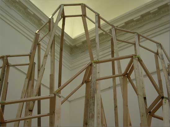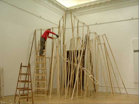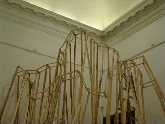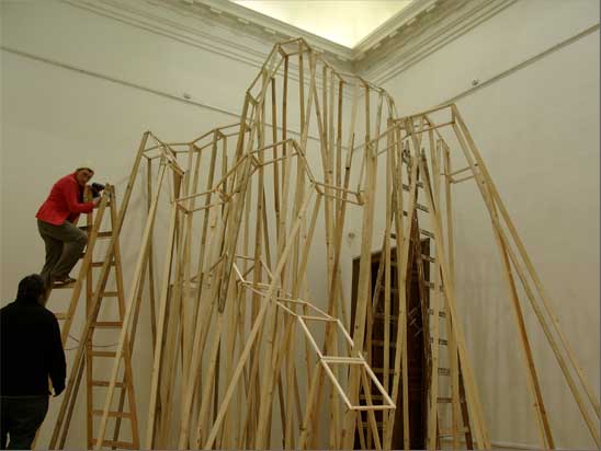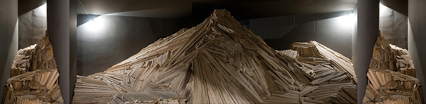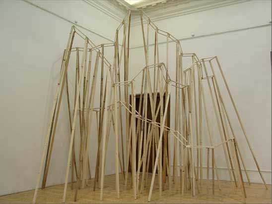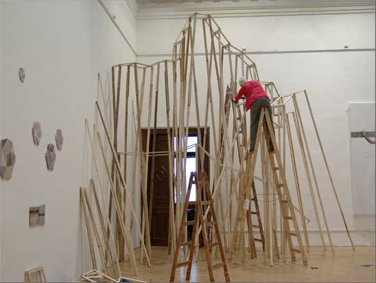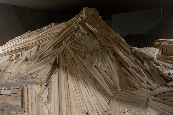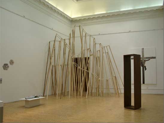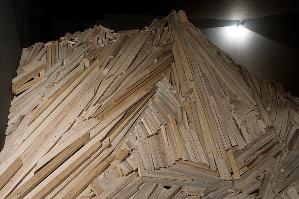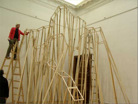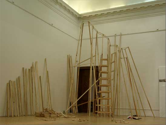 “The Choreography Of The Mountain, built for the show Mechanics of the Canvas in Ernst Museum. This work makes use of the lessons of the Reconstruction of the Lomnicky Peak, but also surpasses the realm of installations for-the-eyes-only, perhaps even going as far as to retrospectively reclassify his earlier works into sculptures. For The Choreography of the Mountain is participatory (it can be climbed): it is not a medium for presenting a work of art; the installation itself is the work of art, it is the corporeal experience of the recipient raised on a pedestal. The real mountain built from rafters is a crystal clear exposition of the formation of space. At the same time, as revealed by the title, the installation draws from stage effects, since the possibility of a mountain hike as an experience in the exhibition space emerges with sensory immediacy. …” (excerpt from Modernist of the Provinces by Áron Fenyvesi. Balkon, 2009.)