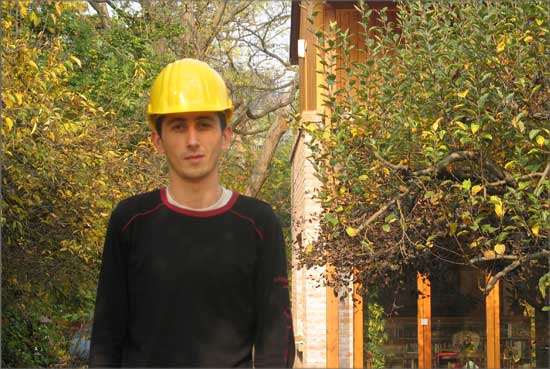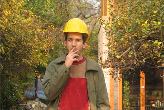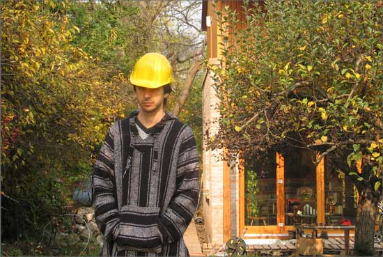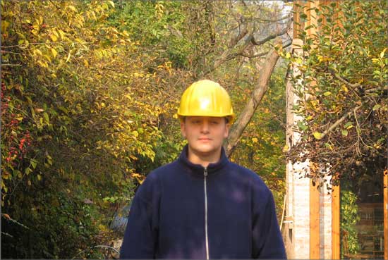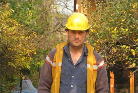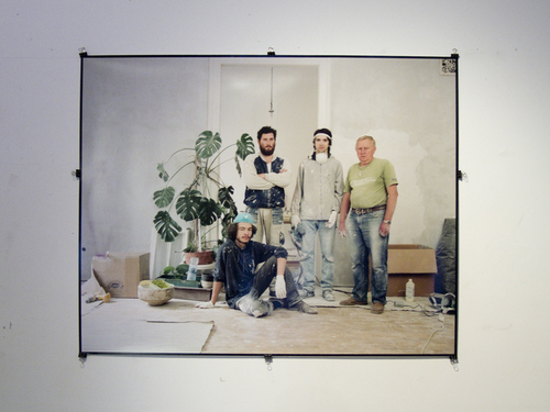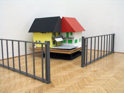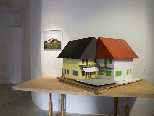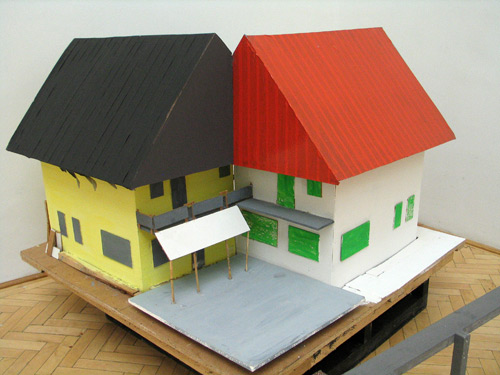 Home-made Mutant is based on the picture of an unfinished twin house in the countryside of Hungary, taken by the photographer Miklós Surányi. When the model of this house was exhibited for the first time, it was shown together with the original photography of the house. Later, it was shown together with group-picture of 4 worker-like people standing in a flat that is under reconstruction. The people on the image are the artist himself, his friends and relatives. The situation depicted is real, as they were all working together on the reconstruction of a flat, so the photography documents them as workers, although none of them is a professional worker. Both the building and the photography reflect on the very common we-do-it-ourselves attitude of people from the former eastern block.