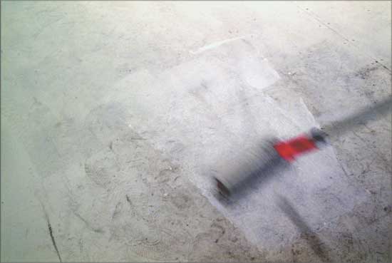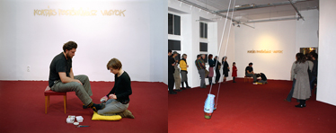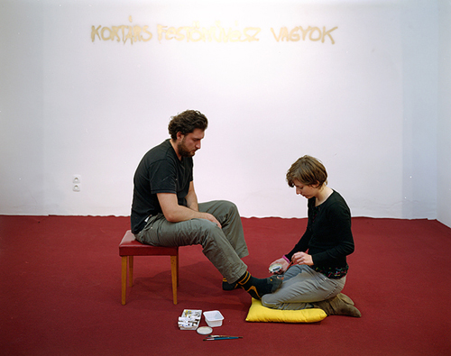 For the event, the floor of the gallery was completely covered with red carpet, and onto the wall in front of the entrance read the spray-painted words: “I am a contemporary painter”. The text served as a background for the action. In front of it, Judit Fischer (a young contemporary painter) painted István Csákány's toe - peeping trough a hole in his sock - grey. She covered the toe in the same grey tone then the one of the socks, so from a distance, people could hardly recognize the hole after the painting.