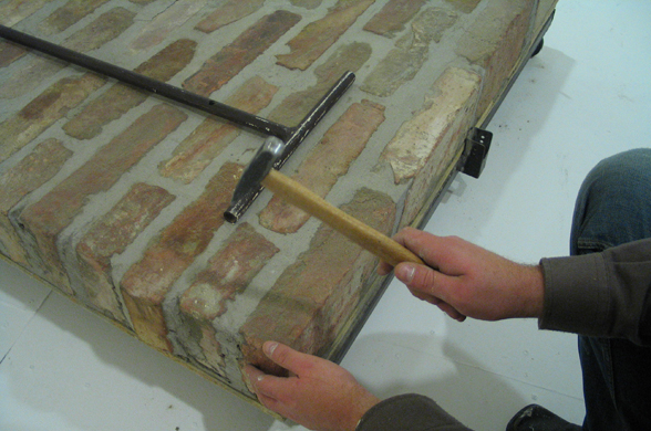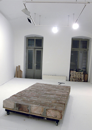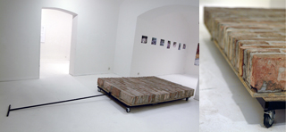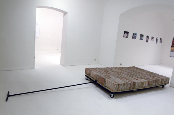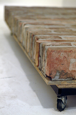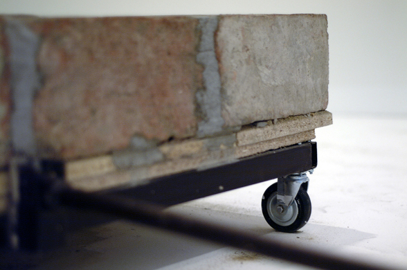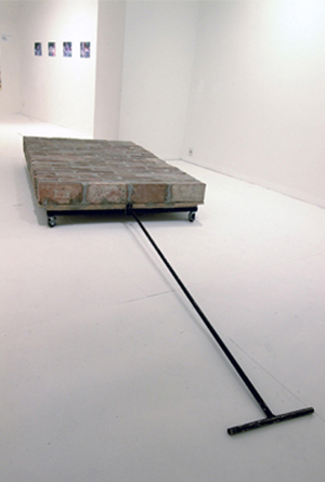 A pathway piece on wheels made of bricks, with a pulling bar. Piece of the exhibition Work Title.