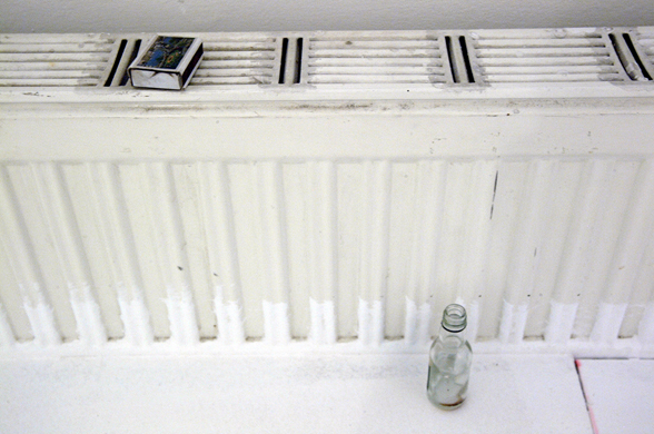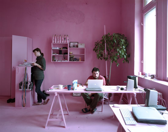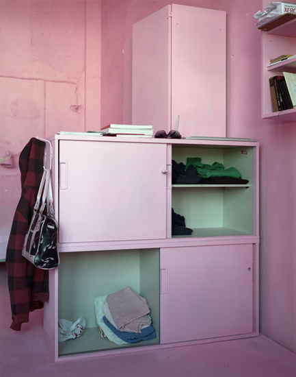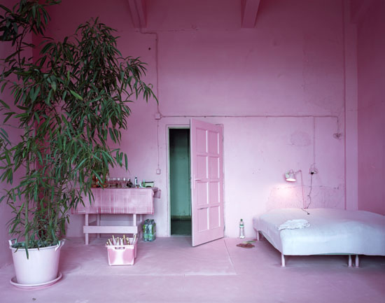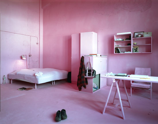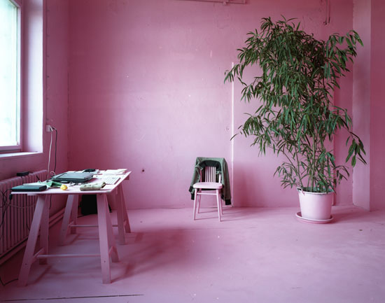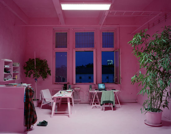 The It Was An Experience To Be Here! installation has been realized during a 3 month residency in Prague at a cultural institute called Meetfactory. For the installation, Csákány painted the working- and living-space (all furniture, walls, lights etc.), everything he found there when he came, with pink paint. Only his private objects (and the plants) stayed without paint. The pink color reflected the light differently from the previously white walls and dull items, it completely transformed not only the room and the furniture, but also the experience of being in the very same room. This work reflects on the special status of an artist in residency, who finds himself in situation where he is forced to build up his own private sphere in the given temporary space. He used the pink color to build - with a bit of irony - a contrast between the rough surrounding of my living, a grim, deserted factory district very close to a cargo handling station, and his private living room. After the open studio event, he continued living in the pink space until the end of his stay.