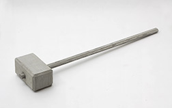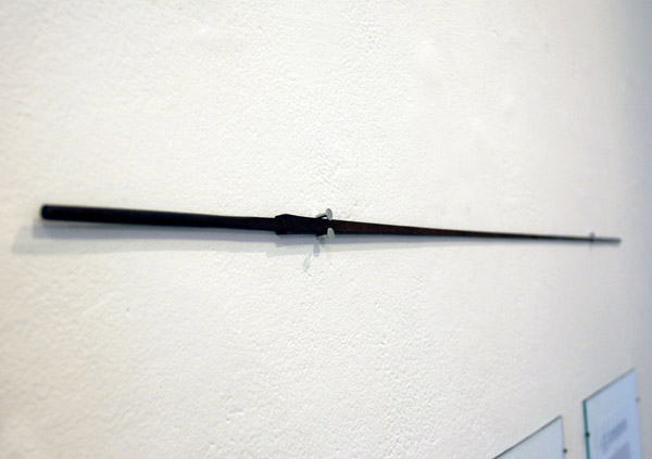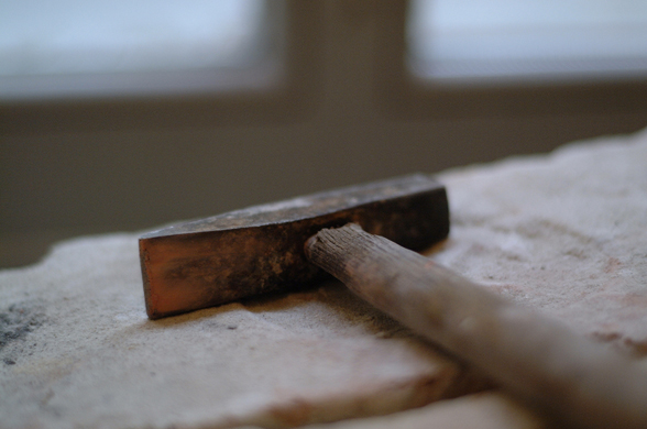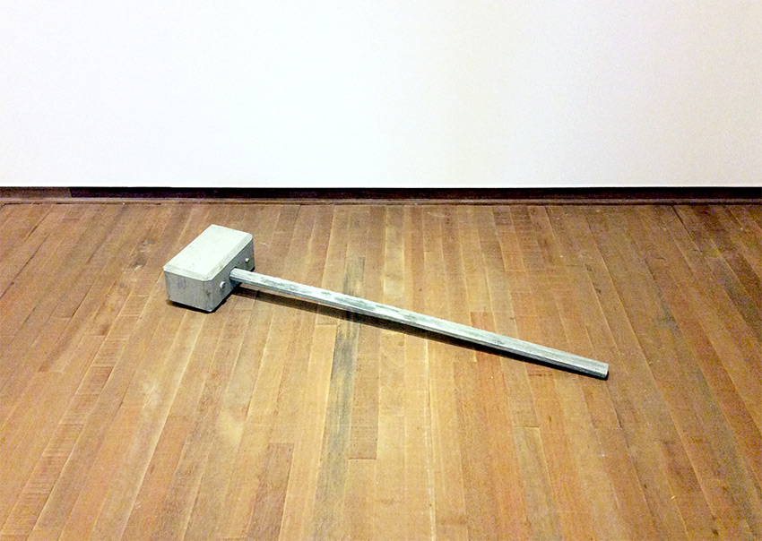 The enlarged hammer is a cast from concrete. It is inspired by an archive picture from a inauguration ceremonial where a man is ramming the first pole of a new museum building ( Bonnefanten Museum in Maastricht) with a huge wooden hammer into the ground. Csákány combines the size and shape of the hammer with heavieness und roughness of the concrete. The piece especially in the context of a (exhibtion)space and other art works provoces an act of destruction. It reflects on the "maybe" unavoidable destruction that goes along with building something new, not only in the field of architecture but also in the field of culture and art.