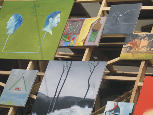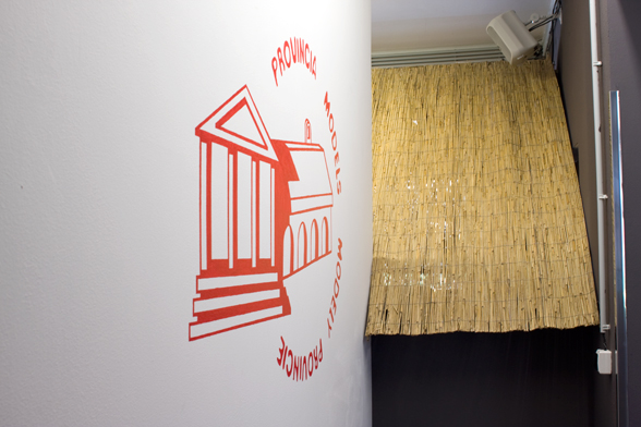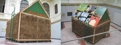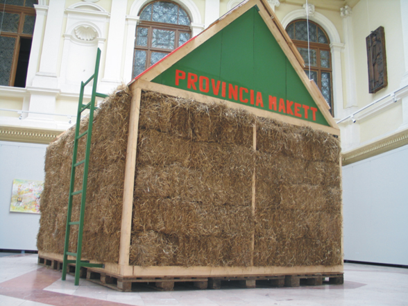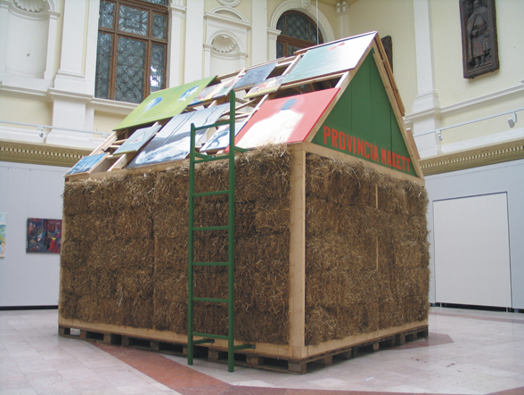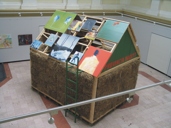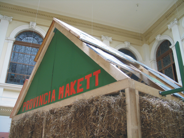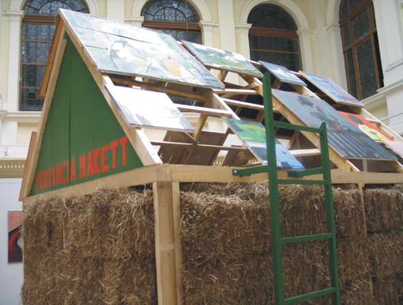 The Province Model is a house with walls made of straw, and a roof that is covered by paintings from the artist and his friends they have made during their time as students of the academy. On the front facade of the roof, there is an inscription that reads PROVINCIA MAKETT. A metal ladder is placed on each side of the building, so the audience could climb up and get a close look of the paintings.