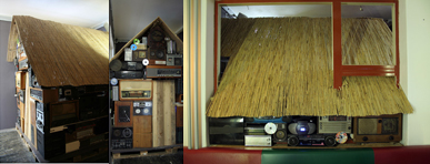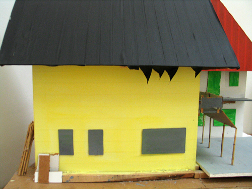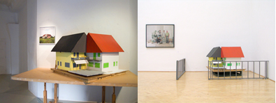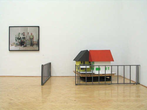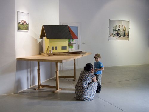 2008, house modell (wood, tape, paint) 150x150x70 cm, photography workers (1) (by Miklós Surányi ) 150x100 cm , photography house (5, 6) from photo series Abandoned toys by Miklós Surányi , 90x90cm
