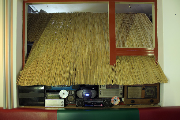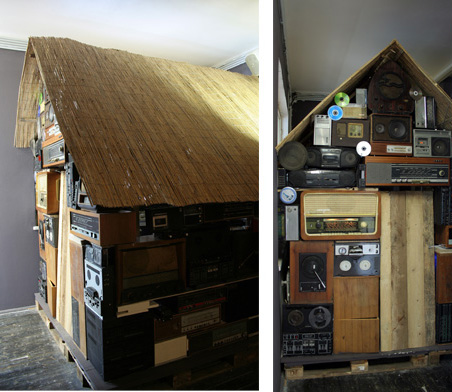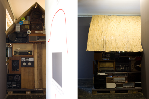 A Citizen's Weekend House is the model of a house, with walls made of functioning and dysfunctional radios. The functioning radios were transmitting the sound of several radio channels simultaneously. For the exhibition at the Stanica Gallery, the windows separating the gallery space from the bar space were removed, and the radio-house building itself and the sound of the radios connected the two spaces. This piece is a quotation of the artist’s painting the Province-Transmitter.