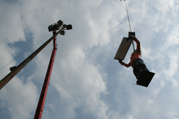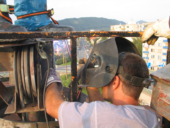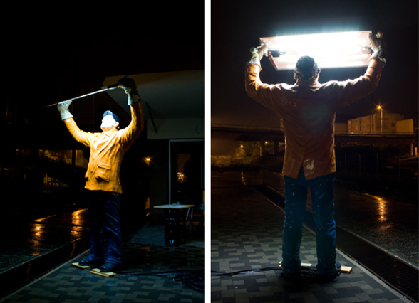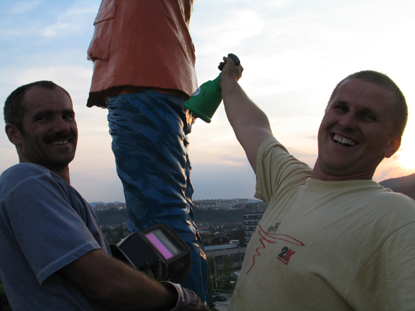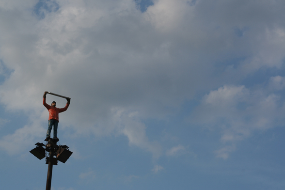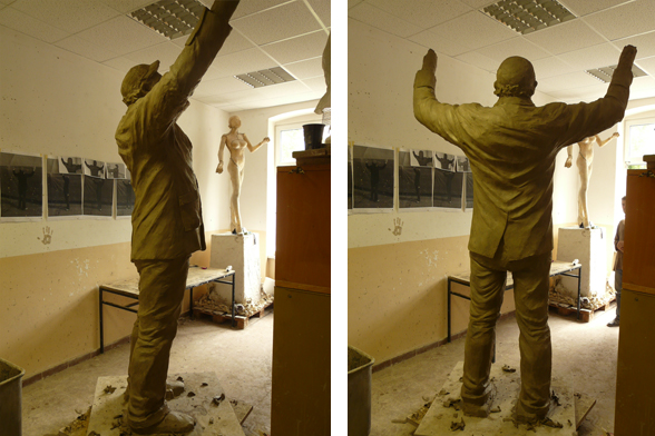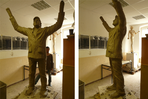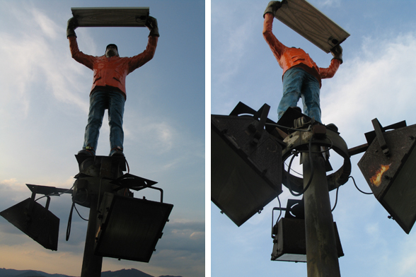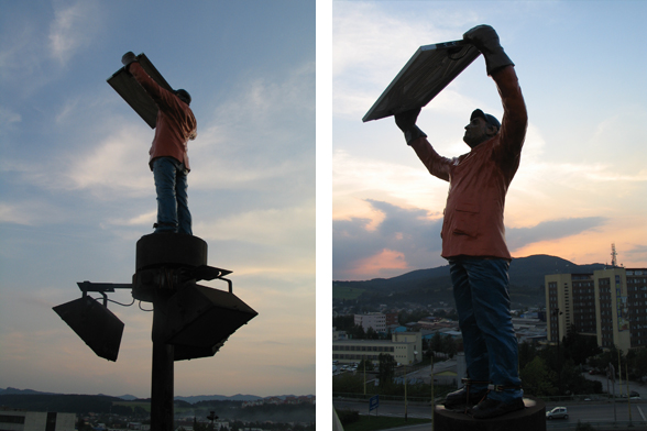 The declaration of the whole construction as a monument and the revitalization of the street lights were the basic ideas of István Csákány's sculpture project. The artist placed a statue on top of one of the lampposts located in the middle of the roundabout. The figure is a realistic, life-size portrait of an average man, the artist itself. He holds a solar panel above his head, with his hands covered by working gloves. The lights placed on the bottom side of the panel use the energy collected in the daytime to illuminate the figure by night. The sculpture serves as a prosthesis by enabling the device, in an indirect way, to spread light again. Of course the fact that the ordinary street light needs its help reflects the given historical background. The statue itself also enters in dialogue with the ideology and the sculptural conventions of socialism. Instead of the pathos and the monumental worker- and peasant figures of socialist realism, it presents a life-size, average man in casual clothing, who looks rather small and lonely in the distance. He seems to consider his heroic gesture as a task or as work, rather than an endeavor that could change the world. But his efforts remain isolated and self-reflective, as in the end, he is only able to light up himself.