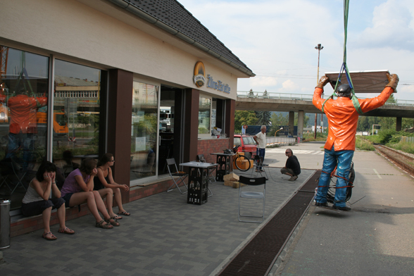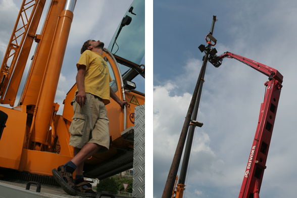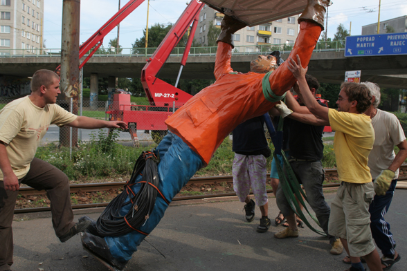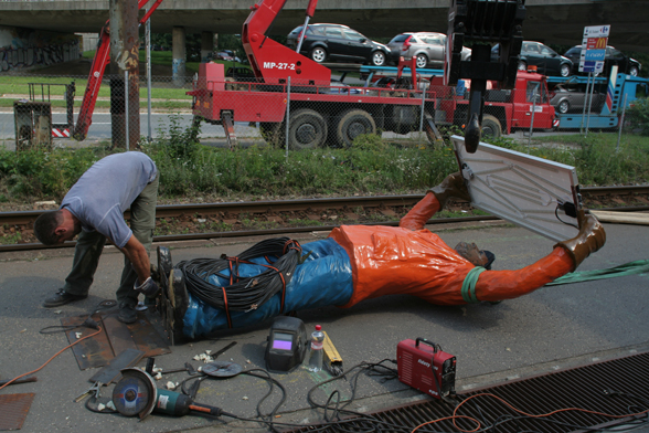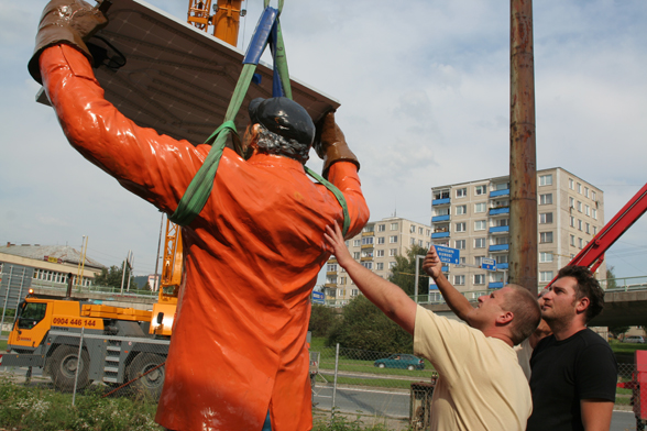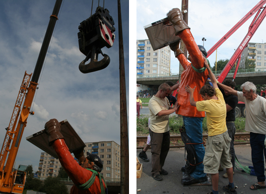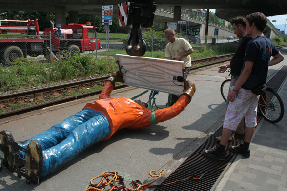 The situation is based on the preparations of the erection of the artist’s piece Monument for a Monument.
