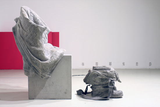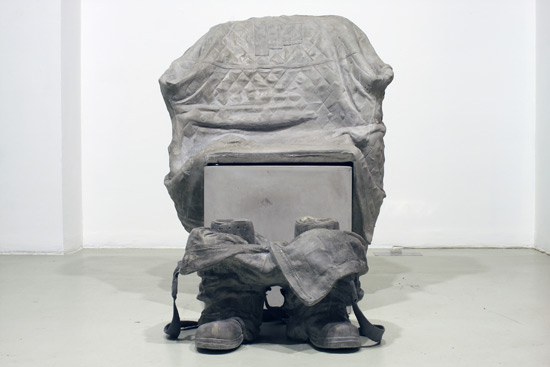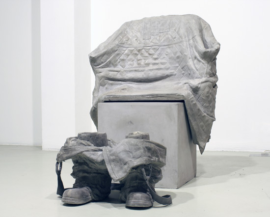 „The pedestal of the worker’s statue is empty - only the absence can be incarnated. Chair, coat, pants, boots - this ensemble forms a figure in ( .. ) sculpture. A figure that is perhaps just slightly bigger than life-size - as expected from the ideal type of the worker - but who is definitely not present. It might appear that the act of raising a statue is an outdated phenomenon, when it is difficult enough to formulate statements about the worker. The absence, heavy as concrete, not only bears the weight of the present, but that of the next moment as well.