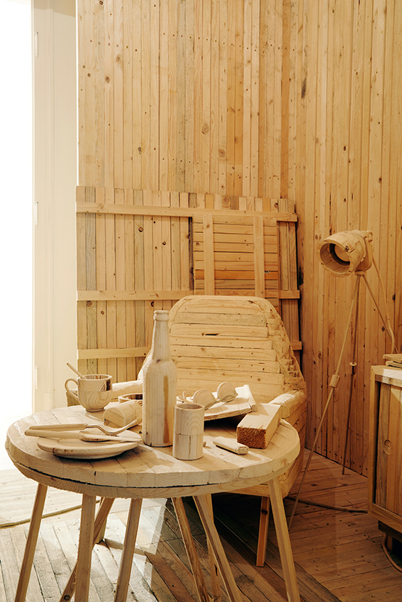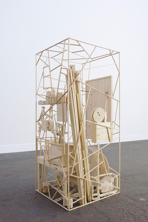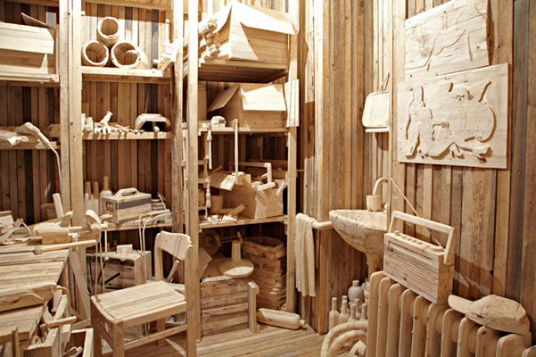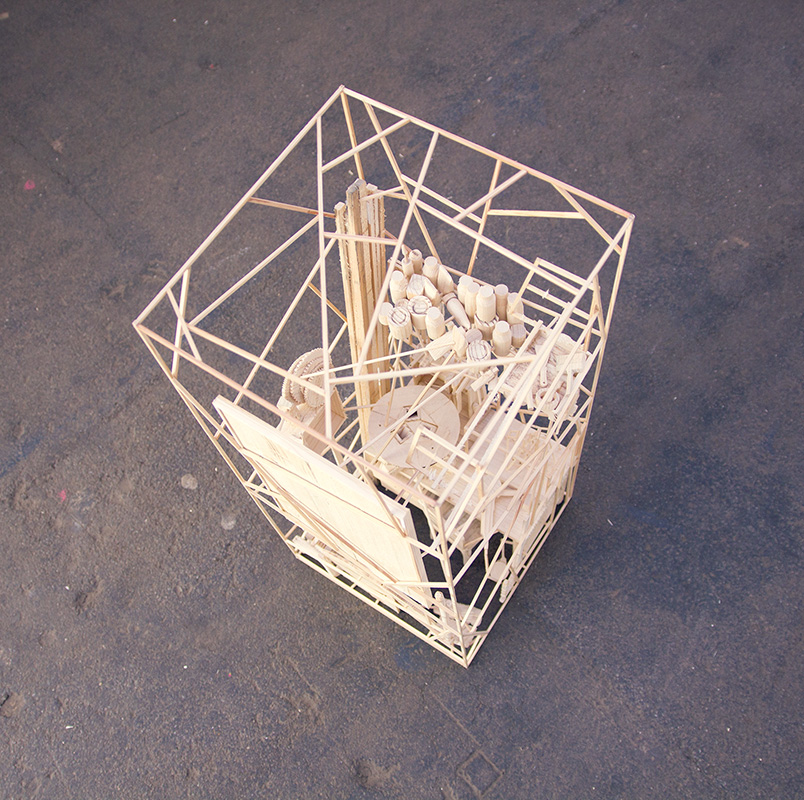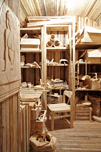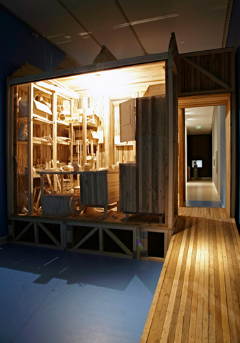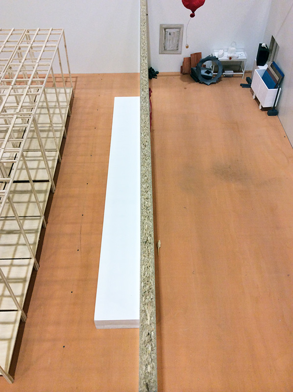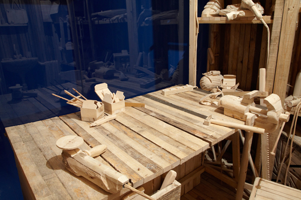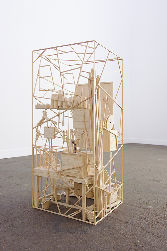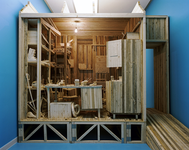 Workspace is a miniature, fragile to-scale wooden reconstruction of an artist’s studio equipped with