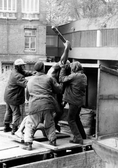 This woodcut shows the efforts of a group of people to raise the huge sculpture of a human.