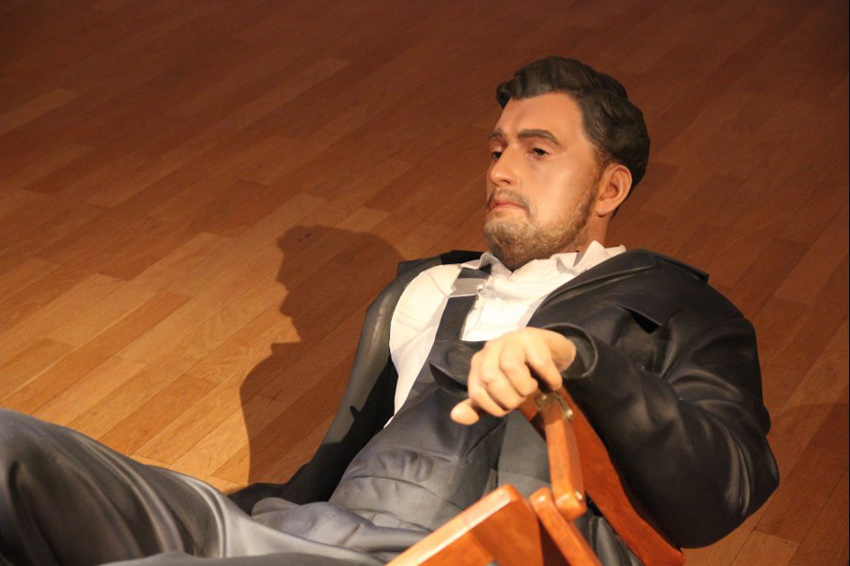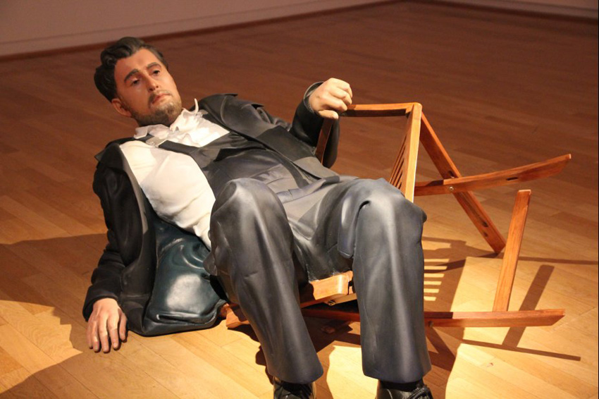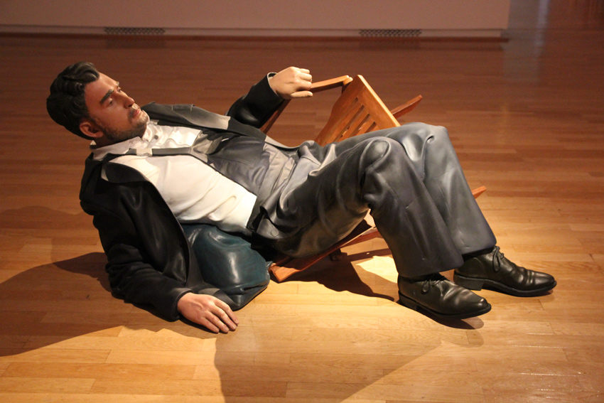 The piece is a realistic sculpture based on a snapshot, that shows the artist
