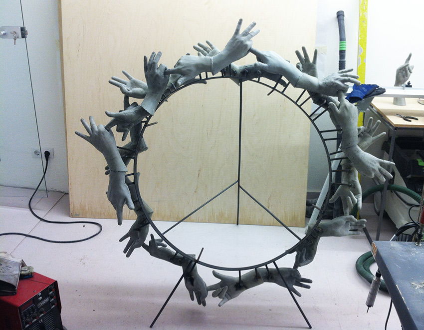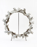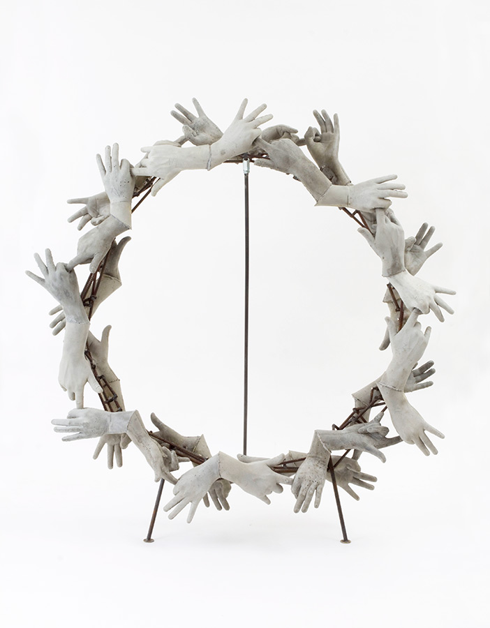 a robust funeral wreath made from concrete and reinforcing bars.