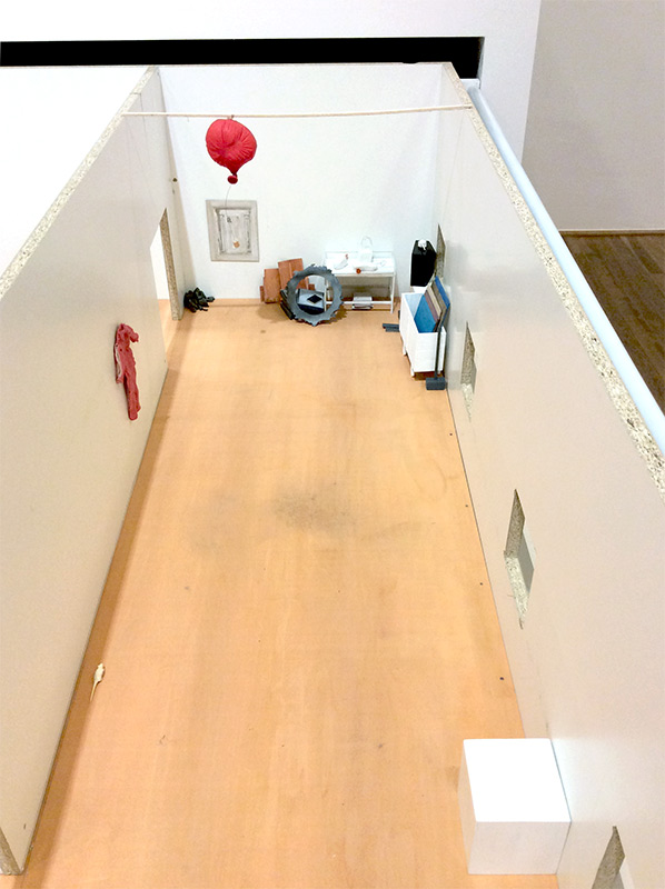 “Peak of Lomnic Mountain” in a showcase and the cast mold for the table legs of “Origin unknown” or, less directly, to a painting without a recognizable motif. Thin wooden rods connect all the objects, tools, material, models, tools and artworks, producing a dense grid-like structure of links and struts that like a scaffolding stabilize inner life, while also delineating it from the outside space like a gate. The everyday objects merge as if they were being densely pressed together, creating a space that generates transparence and insight but also density and perplexity. The miniaturization moves the scene into an artifcial, dreamlike space. What remains for the viewer is the structure of a doll’s house, which you can approach only as in Gulliver’s fairytale with heightened awareness and good will.