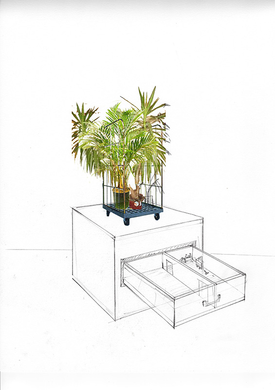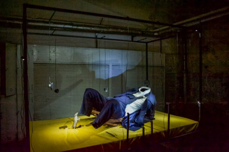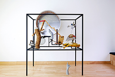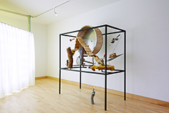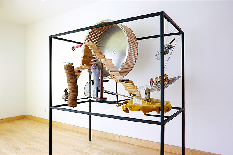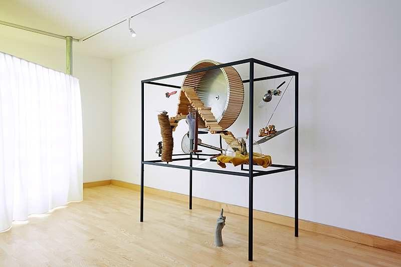 Museum for Rats and People is an object built around a locked up rat. With everyday things placed inside the iron structure, it seems like an open rat cage or lair filled with toys. The objects – such as the big rat wheel – would provide a space for playing and moving around for the rat (if it was set free). The title of the work, as well as the objects inside it, refer to the museum display cases seen in the Surrealist movie of Chris Marker and Alain Resnais, entitled “Les Statues Meurent Aussi”. How much the meaning of an object changes when being decontextualized and locked into a display case / museum?