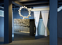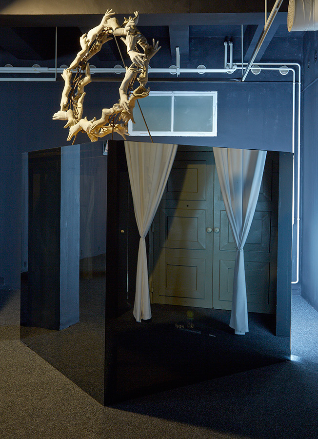 2014, reflective glass, metal, wood, neon-tubes, textile, 190x190x190 cm, Photo: Miklós Surányi