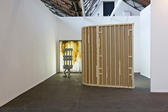 out of wooden boards and timber battens resembling a concrete shell construction and an inner side that is covered from behind by a lightly lit curtain. The form structure and setup of the wall element allude to modernism and Bauhaus architecture. (The height of the wall is adapted to Corbusier’s Modulor scale of proportions, the height of man with an arm raised.) A curtain covers the inside and is backlit by bright neon light. The overly light, almost painfully light situation is both illuminating and blinding and lends the construction something unreal and futuristic. It could be the prototype of a fictive or future architecture that appears auspicious without a definable function or reference but is ultimately self-referential and seems to evade closer scrutiny through the blinding light.